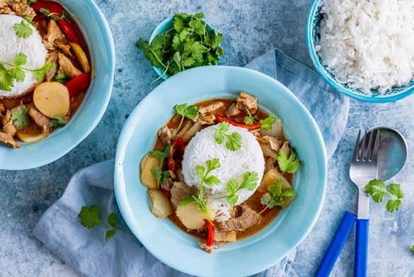 Kok ris som anvist på pakken. Skjær opp paprika i skiver og del nakkekoteletter i tynne skiver. Fres curry paste i varm olje i ca. 1 min. Tilsett kokosmelk og rør godt til en jevn blanding. Ha oppi nakkekoteletter, vann, fiskesaus og sukker. La koke i 3-4 min. til kjøttet er gjennomkokt. Vend inn grønnsaker, og kok videre i ca. 5 min. til. Rør jevnlig.