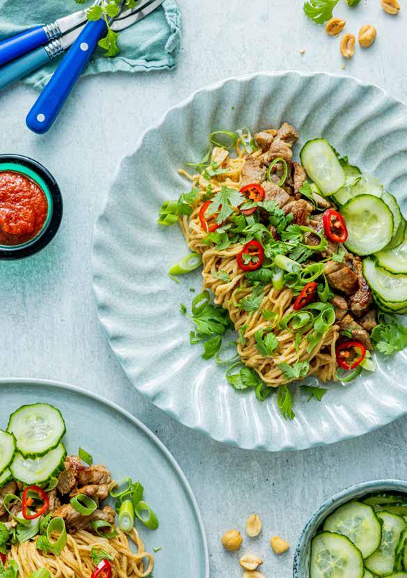 Skjær nakkekoteletter i tynne strimler. Brun i pannen med olje. Salte og pepre. Ha peanøttsmør, finhakket hvitløk og kokosmelk i en gryte. Visp godt slik at peanøttsmøret løser seg opp. Smak til med chilisaus. La sausen putre i noen få minutter. Smak til med salt. Snitt agurkskiver med en ostehøvel. Kok opp vann, eddik, sukker og 1 ts salt. Når sukkeret er løst opp, trekker du gryten fra platen. Kjøl ned noen minutter før du heller væsken over agurkskivene. Skjær vårløk og chili i skiver. Hakk koriander. Kok nudler som anvist på pakken. Vend med peanøttsaus og kotelettstrimler. Strø over chili, vårløk og koriander og server med agurksalat til.