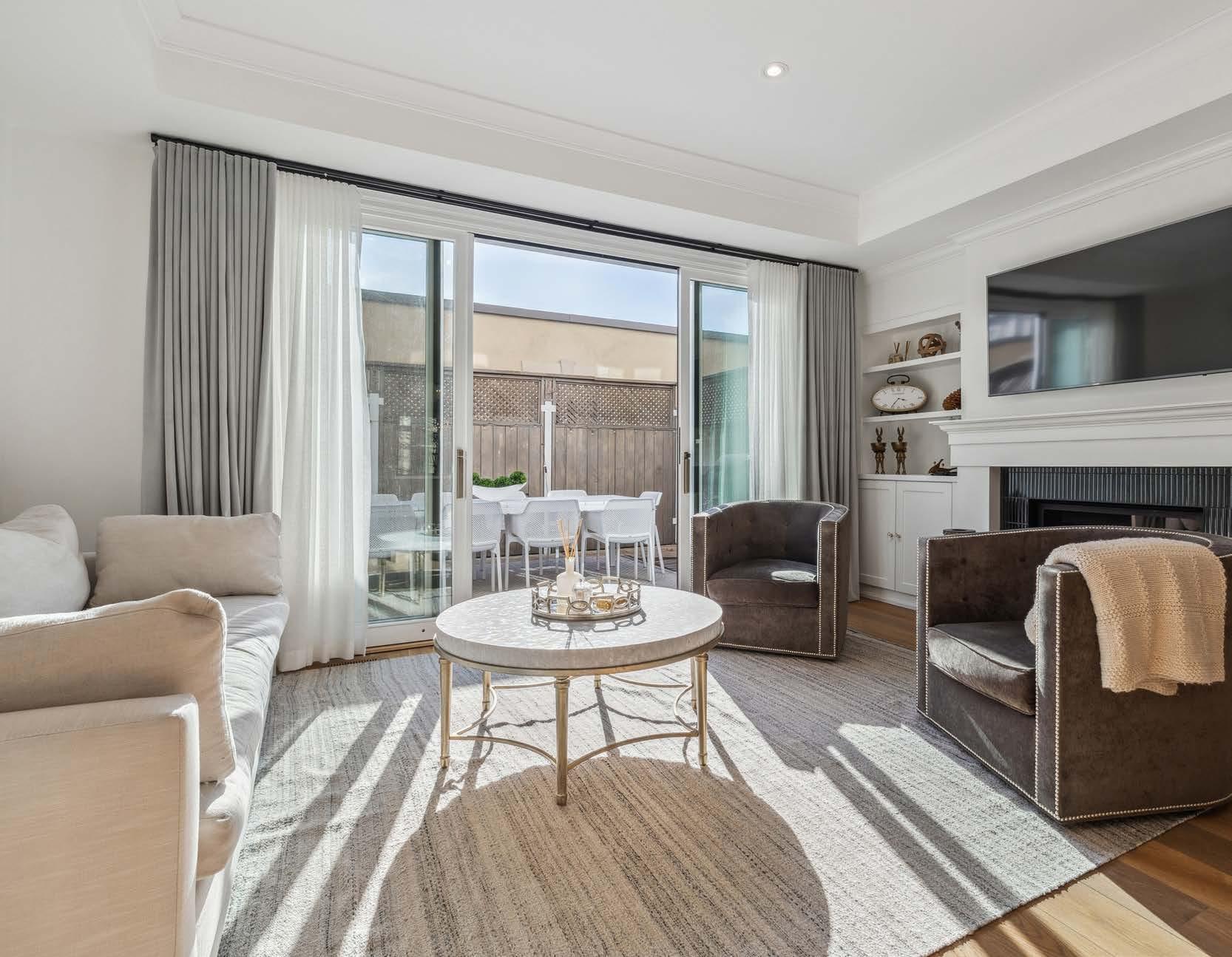 The open-concept main level is designed for both relaxation and entertaining. The custom Bella Kitchen is a standout feature, showcasing European Oak Wide Plank Floors, premium Bosch appliances including a dishwasher, stove, microwave, and speed oven, as well as a Fisher Paykel refrigerator. Cambria Quartz countertops and backsplash enhance the space, while custom cabinetry adds a refined touch. Sunlight streams through sliding doors, creating an inviting ambiance that flows effortlessly to a private terrace— perfect for outdoor dining or morning coffee.
