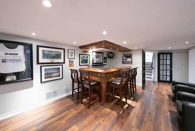 The walk-up basement is designed for entertainment and relaxation, featuring a large recreation area, a home theater space, a gentlemen’s lounge with a bar, and an additional expansive bedroom with a full bathroom.