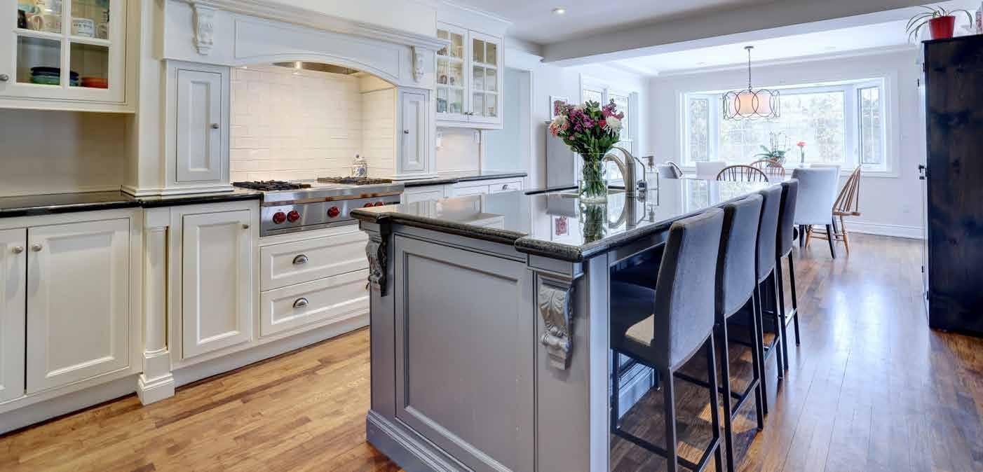 • Eat-in kitchen new paneled refrigerator, Bosch dishwasher, Wolfe gas cooktop, KitchenAid wall oven, custom rangehood, granite counters and kitchen island