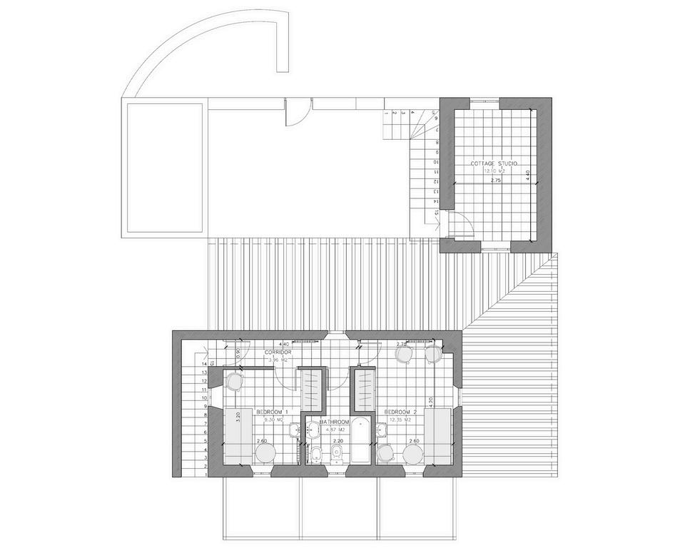 The main house, called CASA-CORTIJO, is a single-story building with an area of about 250 m2 It is accessed through a hall that leads to a courtyard with lush ferns and a glass-roofed pyramid shape, which acts as the central axis of the building, and from which the rest of the rooms are distributed
