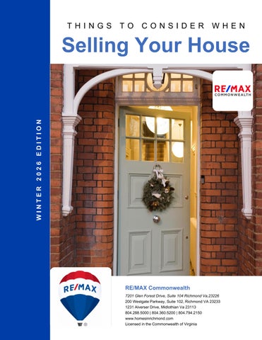 RE/MAX Commonwealth 7201 Glen Forest Drive, Suite 104 Richmond Va,23226 200 Westgate Parkway, Suite 102, Richmond VA 23233 1231 Alverser Drive, Midlothian Va 23113 804.288.5000 | 804.360.5200 | 804.794.2150 www.homesinrichmond.com Licensed in the Commonwealth of Virginia
