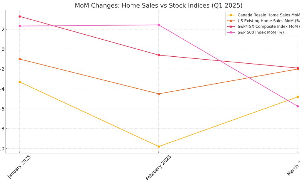 There has always been an anecdotal correlation between the stock market and the real estate market. Is it that if our stock portfolio is performing well, we bring that confidence to real estate? Or is it when our stock portfolio is waning, we tend to focus on real estate investing? So much has been written as to which type of investing is the clear winner over time, I will let you, the reader, delve into that. The focus here is on how these two investment vehicles intermingle, and how the past performance of these indices are the tea leaves of the future. Undoubtedly, the financial markets at the end of Q1 of 2025 were in turmoil, and tempered the real estate market in its wake. The first graph compares the TSX Composite Index against Canadian Resale Home Prices and the second graph compares the annual change in US Existing home sales versus the annual return on the Standard and Poor’s (S&P) stock market index. Without question you can’t live in a mutual fund, and we all need shelter of some sort, let’s establish the fact/fiction that our principal residence is a form of investment, and for most Canadians (Americans) it is our largest.