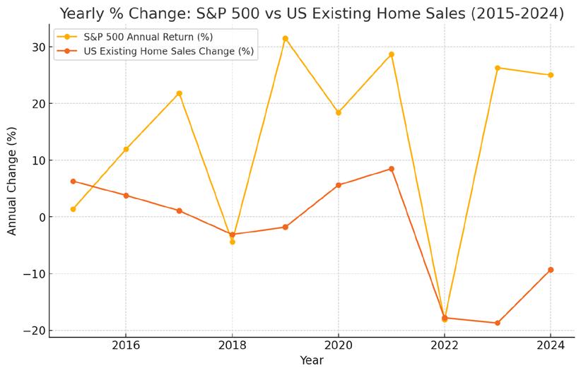 While the stock market is highly sensitive and more foreward thinking, investors can react in real-time to things like inflation, interest rates, employment, and corporate data. Both the S&P index and existing home sale fluctuations show some correlation by moving in the same direction with the positive and negative directions of the broader economy. Furthermore, the higher mortgage rates of post Q1 of 2022 and pressure on affordability has widened the gap between these two asset classes in the US.