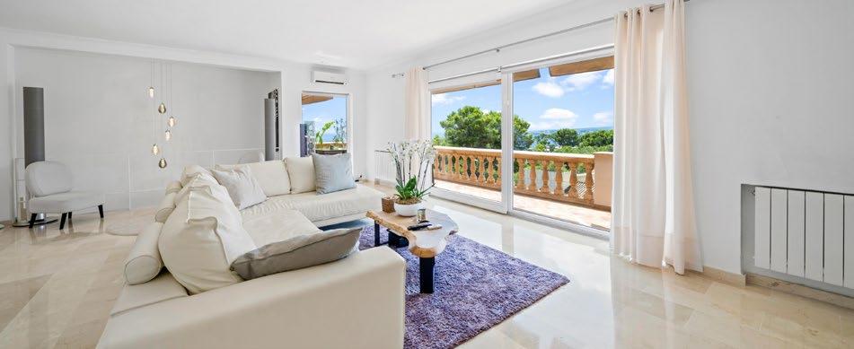 Spacious, bright and luxurious: This villa in Costa den Blanes in the Southwest of Mallorca o ers a fantastic sea view due to its elevated position. On 2 floors with 263 m2 of living space, it combines comfort with elegance. There is an open-plan living room with dining area, kitchen and laundry room, the master bedroom with bathroom and walk-in wardrobe, 3 more bedrooms and bathrooms, entrance hall and 3 terraces. There is also a double garage, a swimming pool with sun terrace, barbecue area and garden. The villa is equipped with marble floors, double-glazed aluminium windows, PVC shutters, built-in wardrobes, central heating, air conditioning and the designer furniture can be included. It is located only 900 m from the beach.