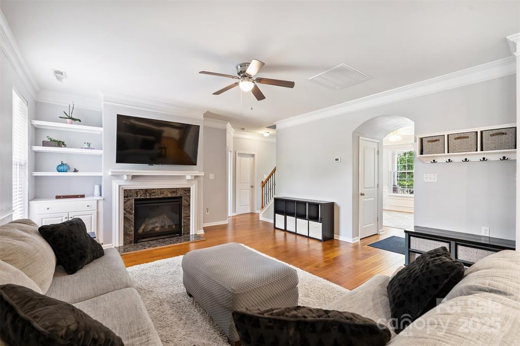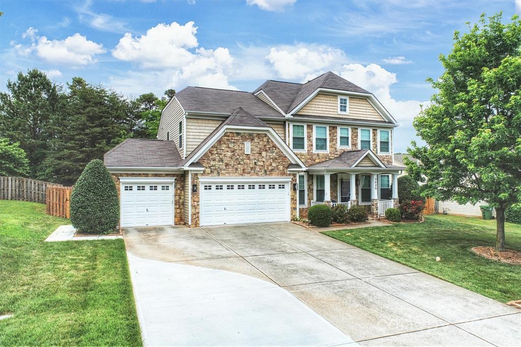 Stately home that has been meticulously maintained with stone accents and rocking chair front porch offering custom features in fabulous location close to Charlotte! Enjoy wood laminate floors on the main level, incredible open kitchen with island, stainless appliances, sunny dining nook and family room with built-in shelves and gas fireplace. Guest suite and full bath on the main level, drop zone, abundant storage, living room and dining room offer lots of flexibility! The upper level features four bedrooms including a stunning primary suite with oversized bathroom and walk in closet. Newer carpet, large laundry room and secondary bedrooms and hall bath complete the upper level. Many opportunities for outdoor enjoyment include screened porch with built-in table, extended patio and driveway, privacy fence, shed, playhouse and community pool! Three car garage w/ EV charger, and freshly painted exterior complete this fine home! Newer HVAC, all appliances remain, close to everything!