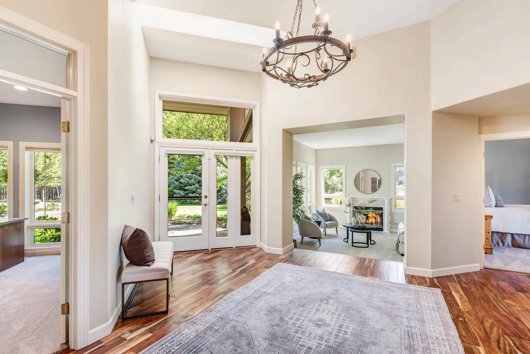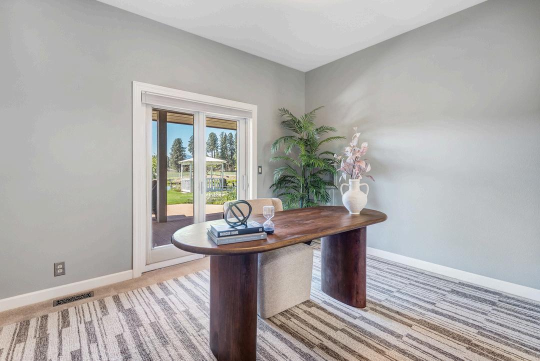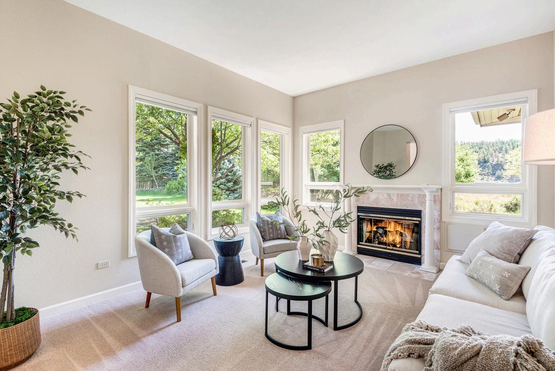 Elegant living room with wood-burning fireplace; flexible formal dining room that could serve as an office or guest bedroom; dedicated office space that easily converts to another bedroom