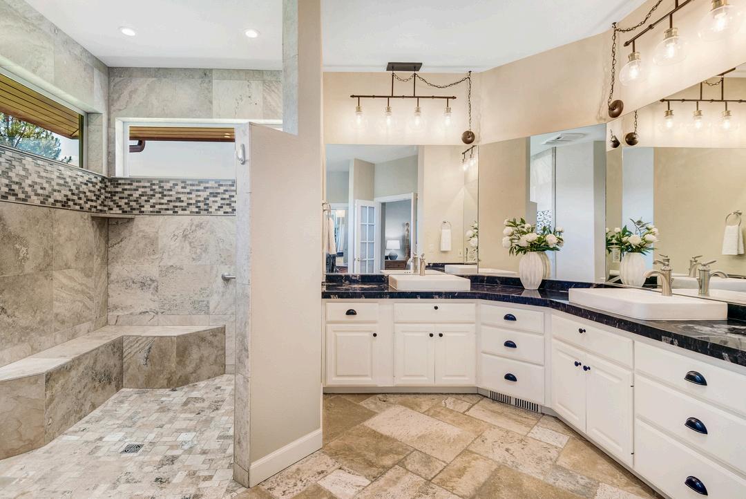 Master bathroom boasts an oversized walk-in dual-head tile shower, radiant heated tile flooring, spacious walk-in closet, extended corner granite vanity with dual sinks, expansive mirrors, and abundant built-in storage; ceiling-mounted fan, heater, and lighting all operate on programmable timers