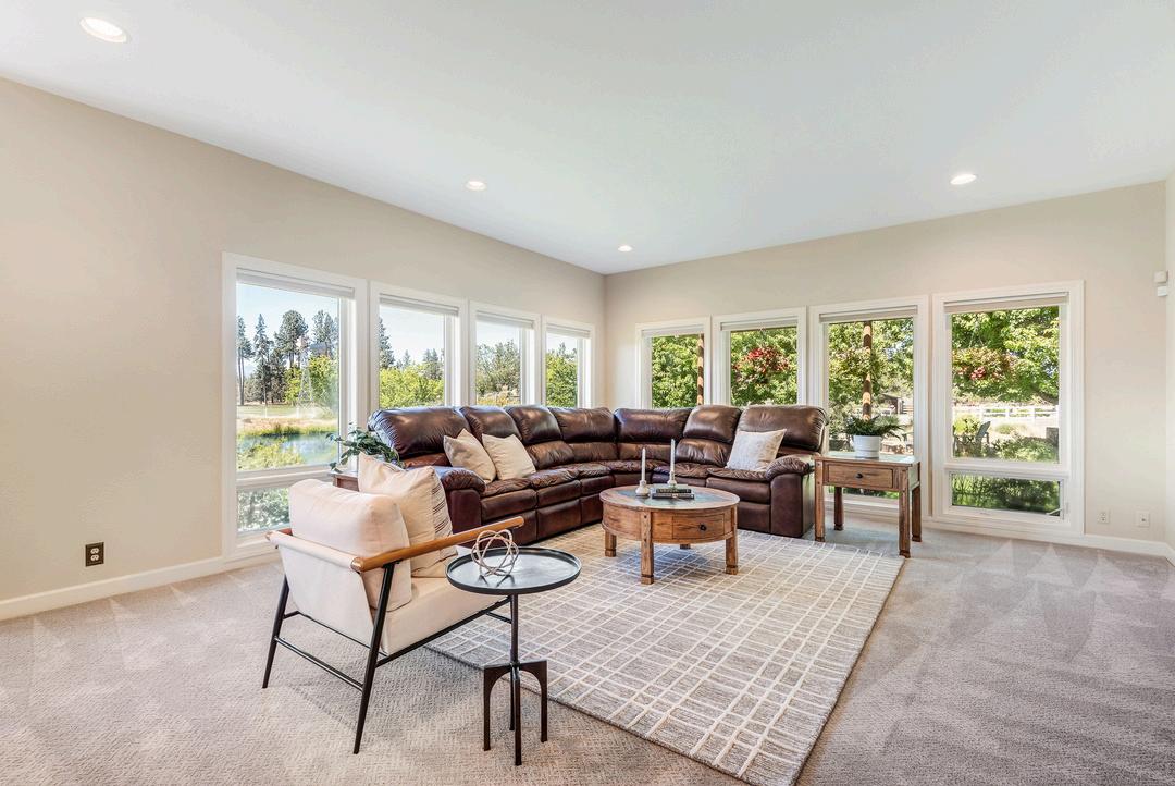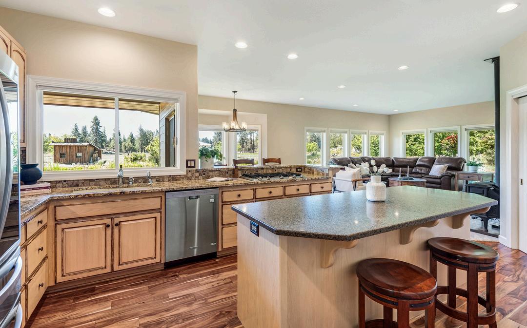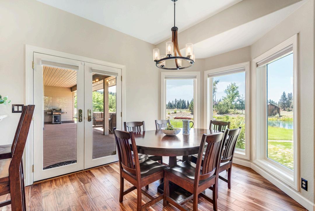 Abundant natural light flows through expansive Pella wood-framed windows positioned throughout the home; nearly floor-to-ceiling windows wrap around three sides of the house, offering views of the yard, pond, meadows, and mountain vistas