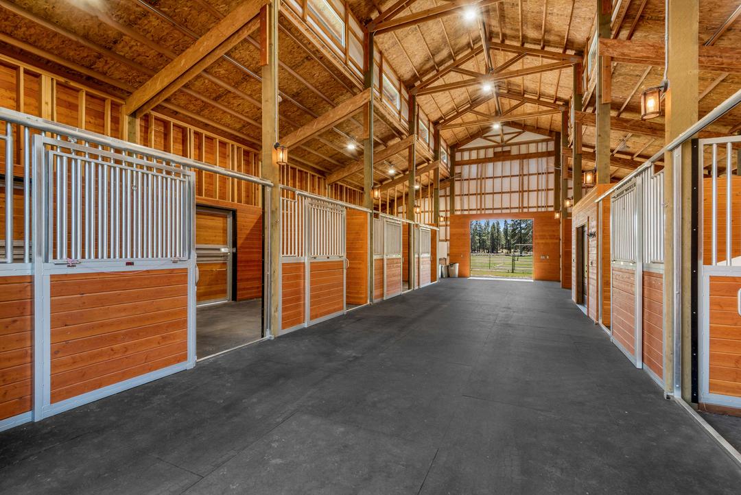 Six dedicated horse stalls; two stall spaces currently house the tack room, bathroom, and wash station, while the remaining two stall areas serve as hay storage and utility space but can easily be converted back to horse stalls if needed (premium Noble panels installed throughout)