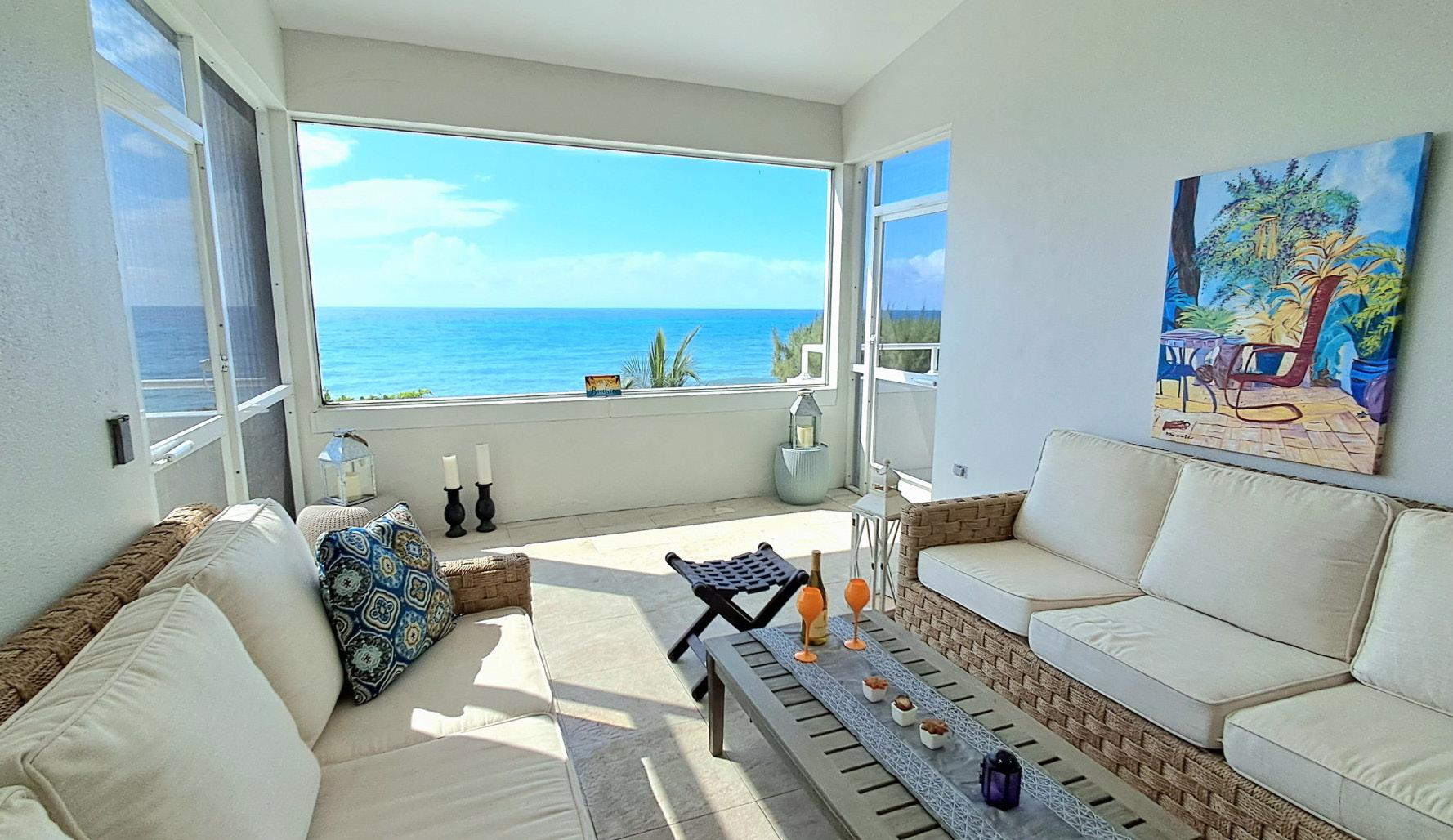 Stunning 2-bed penthouse with lock-off option, beachfront views, ocean breezes, balcony, modern kitchen, watersports, and walkable East End location.