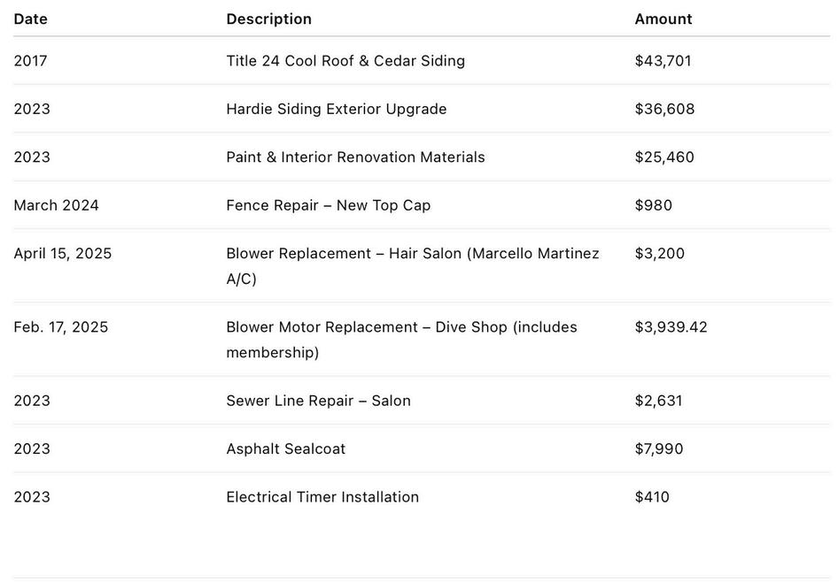 Recent capital improvements totaling over $110,000, including new siding, HVAC for both suites, updated sewer lines, fresh paint, and asphalt resurfacing