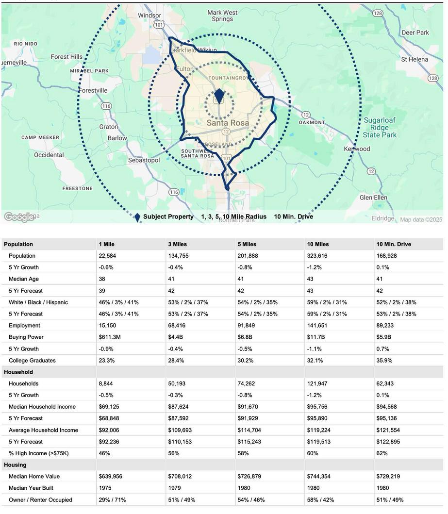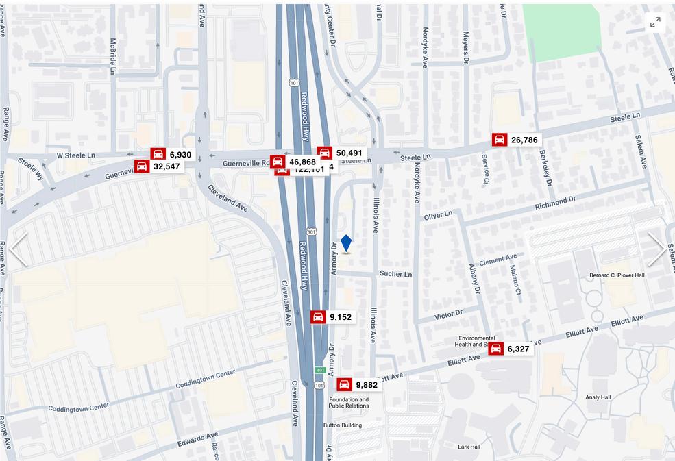 Strategically located just off Highway 101, this ±3,336 SF single-story commercial property offers outstanding exposure along Armory Drive with daily traffic counts exceeding 46,000 vehicles on nearby corridors including Guerneville Rd, Steele Ln, and Santa Rosa Ave. The property sits within walking distance of Coddingtown Mall and is surrounded by a dynamic mix of national retailers such as Whole Foods, Starbucks, BJ’s, The Habit, Orangetheory, Crunch Fitness, Chase, and Denny’s, ensuring consistent consumer draw and tenant demand.