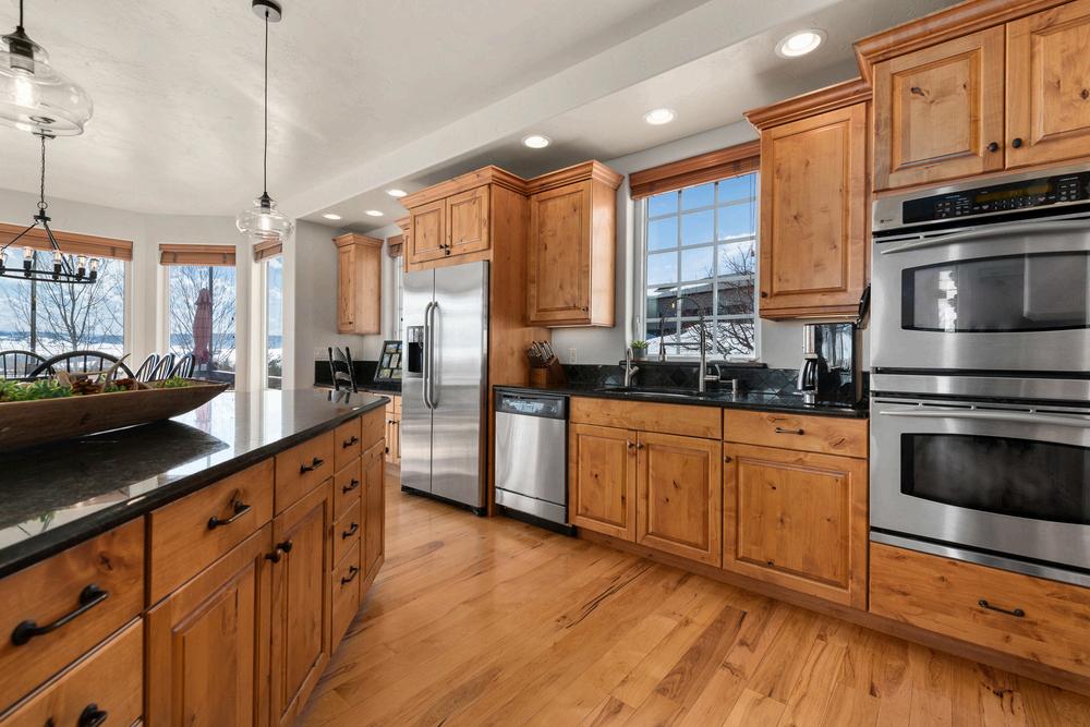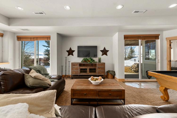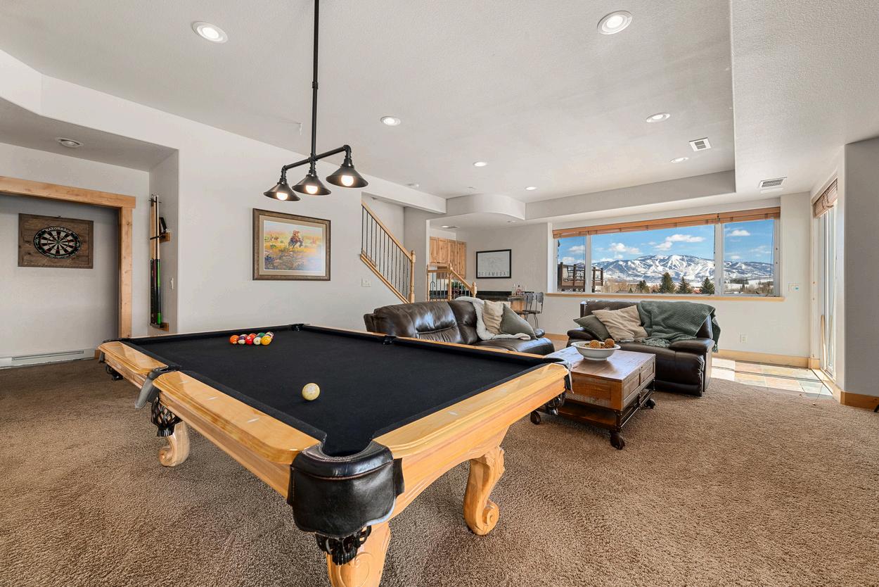 The lower level is a hub of entertainment and relaxation, featuring a large rec room complete with a pool table, foosball, darts, and a wet bar.