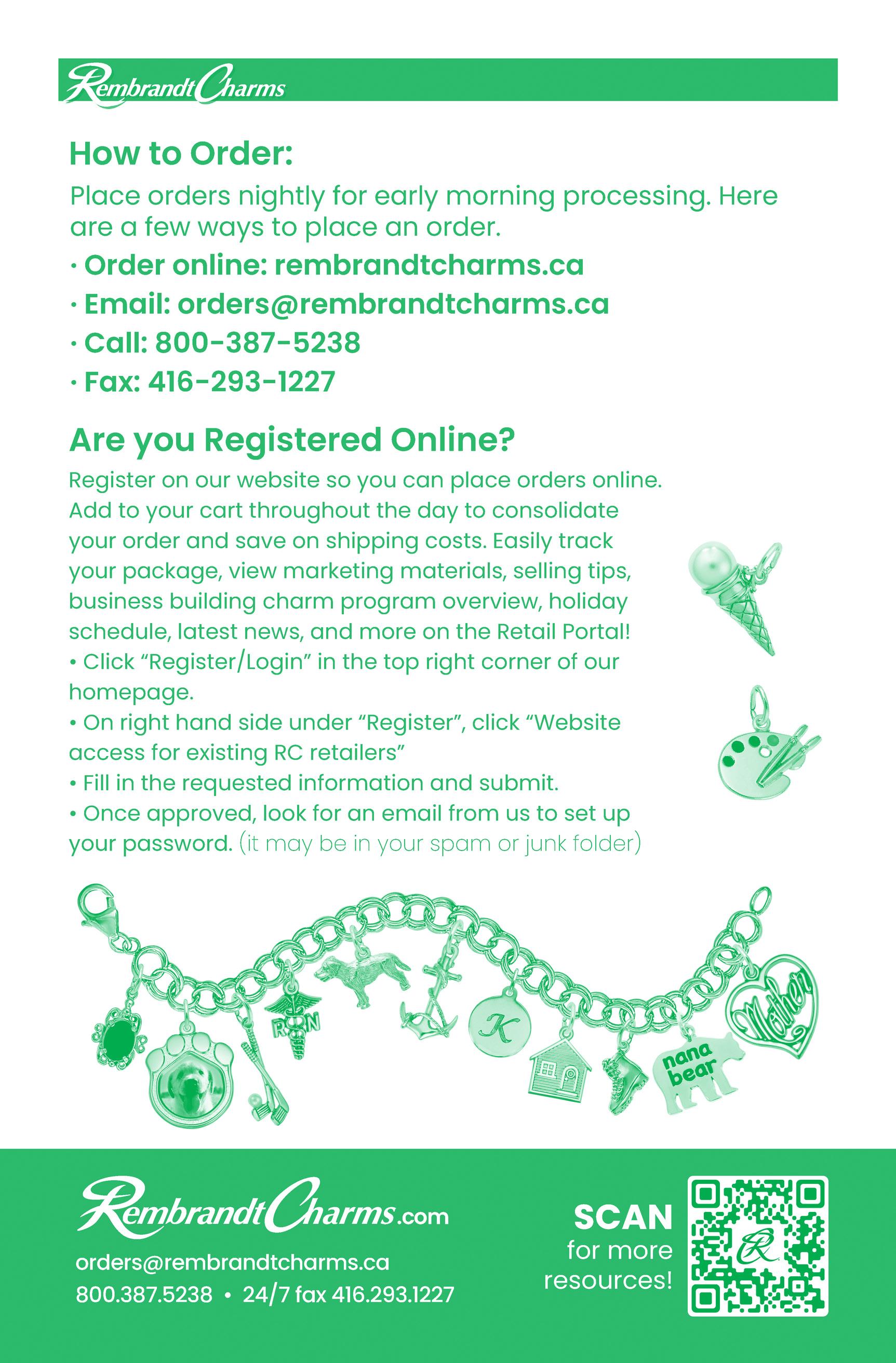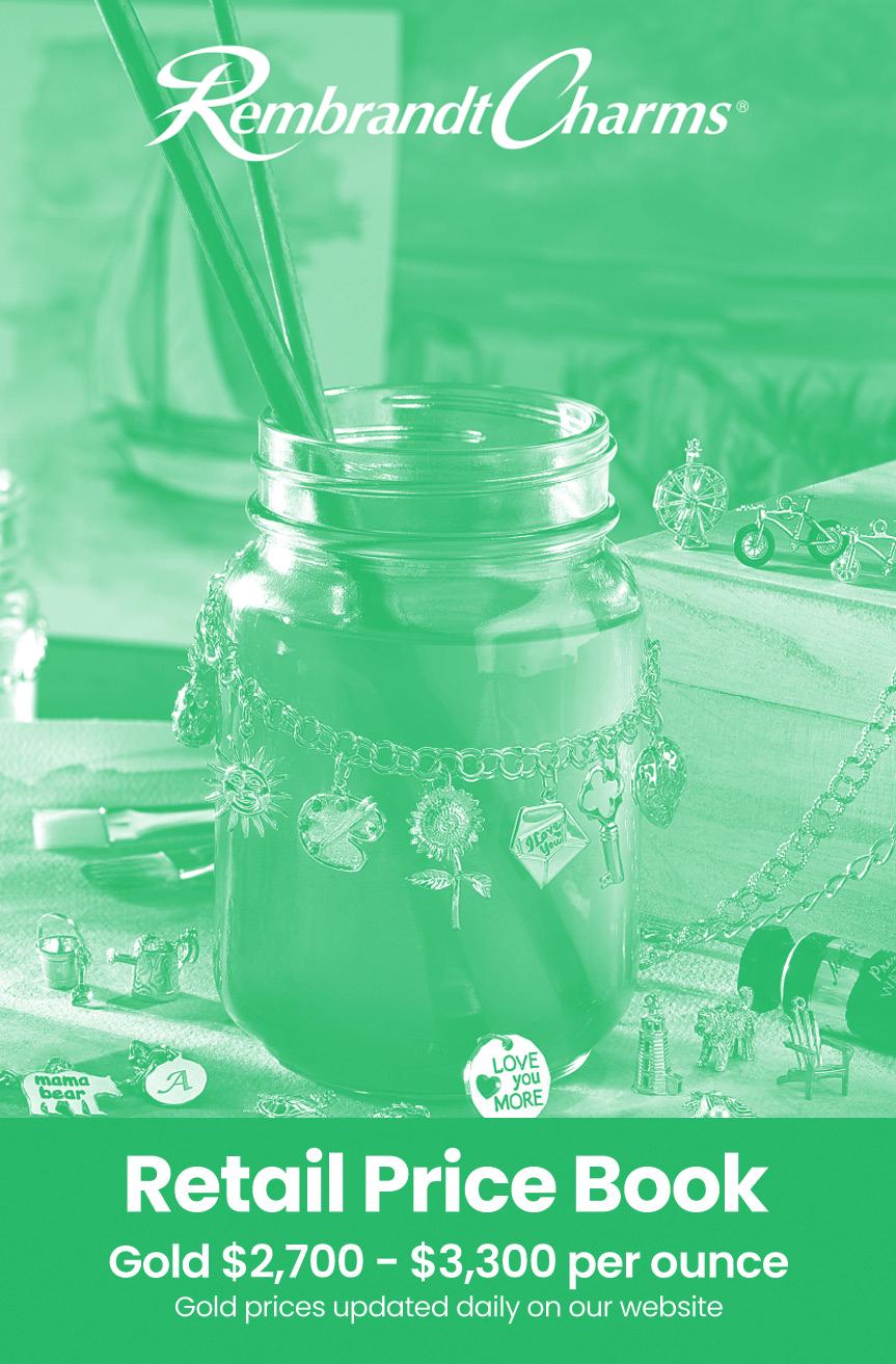 EMAIL orders@rembrandtcharms.ca CUSTOMER SERVICE 800.387.5238 ONLINE* RembrandtCharms.ca *Only Retail Jewelers can purchase from our website after registering. FAX 24/7 416.293.1227 GOLD SURCHARGES All prices subject to change. We reserve the right to make corrections in this book. Gold prices are updated daily on our website. PB050624 Prices effective 05/06/2024. $3,450.01 - $3,525.00 +9% $3,375.01 - $3,450.00 +6% $3,300.01 - $3,375.00 +3% $2,700.01 - $3,300.00 +0% $2,625.01 - $2,700.00 -3% $2,550.01 - $2,625.00 -6% Ordering Information