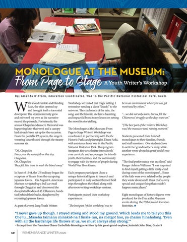 be in an environment where you can get motivated by others.” “…we did not only learn, but we felt the CHamorus’ struggles as the days went on.” “[The best part of the Writers’ Workshop was] the massacre tent, raining moment.” Students presented their finished monologues to their families, friends, and staff members. One student chose to write her grandmother’s story, while another wrote about his great-uncle’s war experience. “The final performance was excellent,” said Ranger Ashton Williams. “I was surprised to find myself getting a little misty-eyed during some of the monologues!... Some of the kids were even related to the people they wrote about and I think that’s a very special and unique thing that couldn’t happen many places.” Eight monologues of historic figures were produced for the Day at the Museum events during the 75th Guam Liberation festivities.