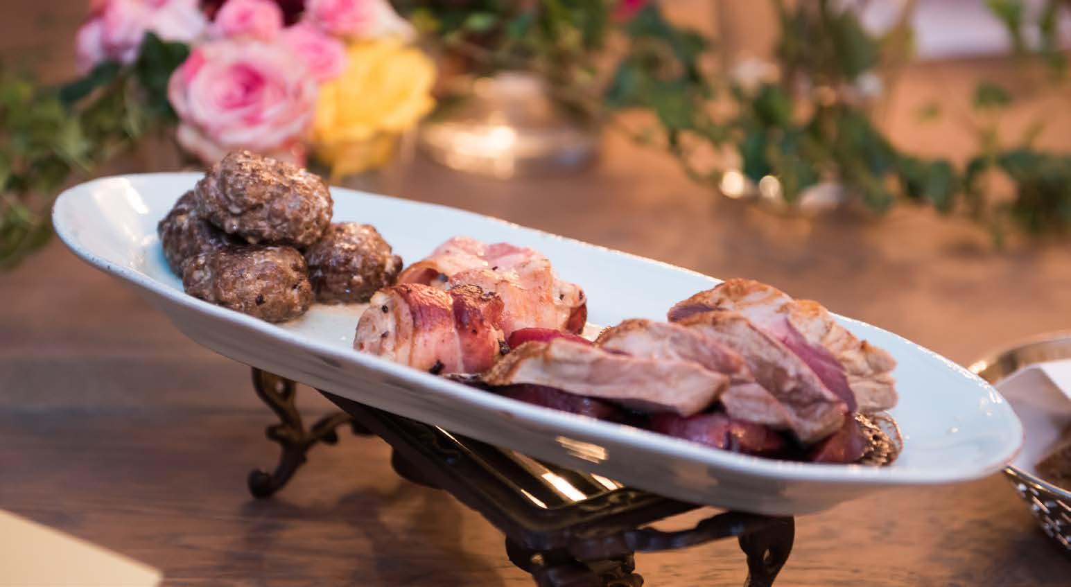 Schweinsfilet mit Zwetschgensauce, Poulet im Speckmantel, Rindshacktätschli mit Rahmsauce, Kartoffelstock, Spätzli, rustikales Saisongemüse
