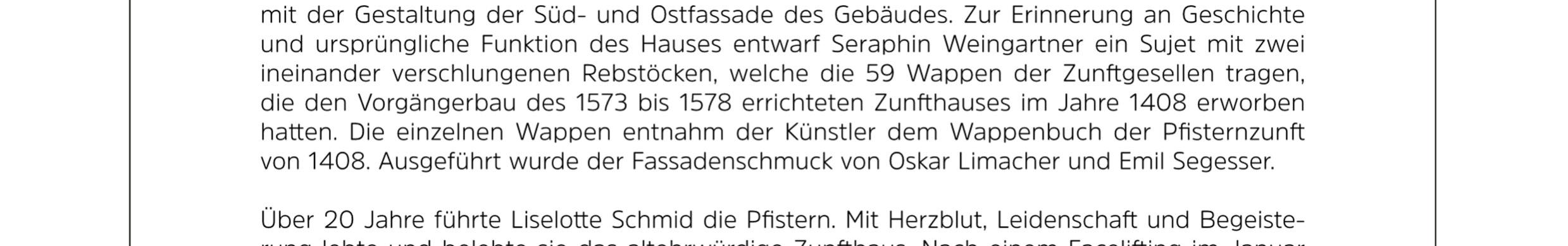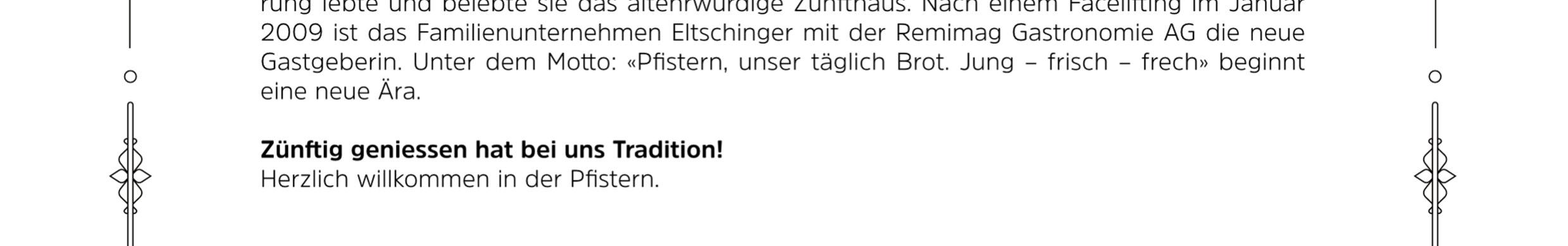 Das Pfistern-Motto «Unser täglich Brot. Jung-frisch-frech» steht für knusprig frisches Brot, zünftigen Genuss und einer Tradition, welche bis ins Jahr 1578 zurückführt. Gönnen Sie sich eine Auszeit an schönster Lage und lassen Sie sich verwöhnen –mit Schweizer Spezialitäten und herrlichem Blick auf die Kappelbrücke.