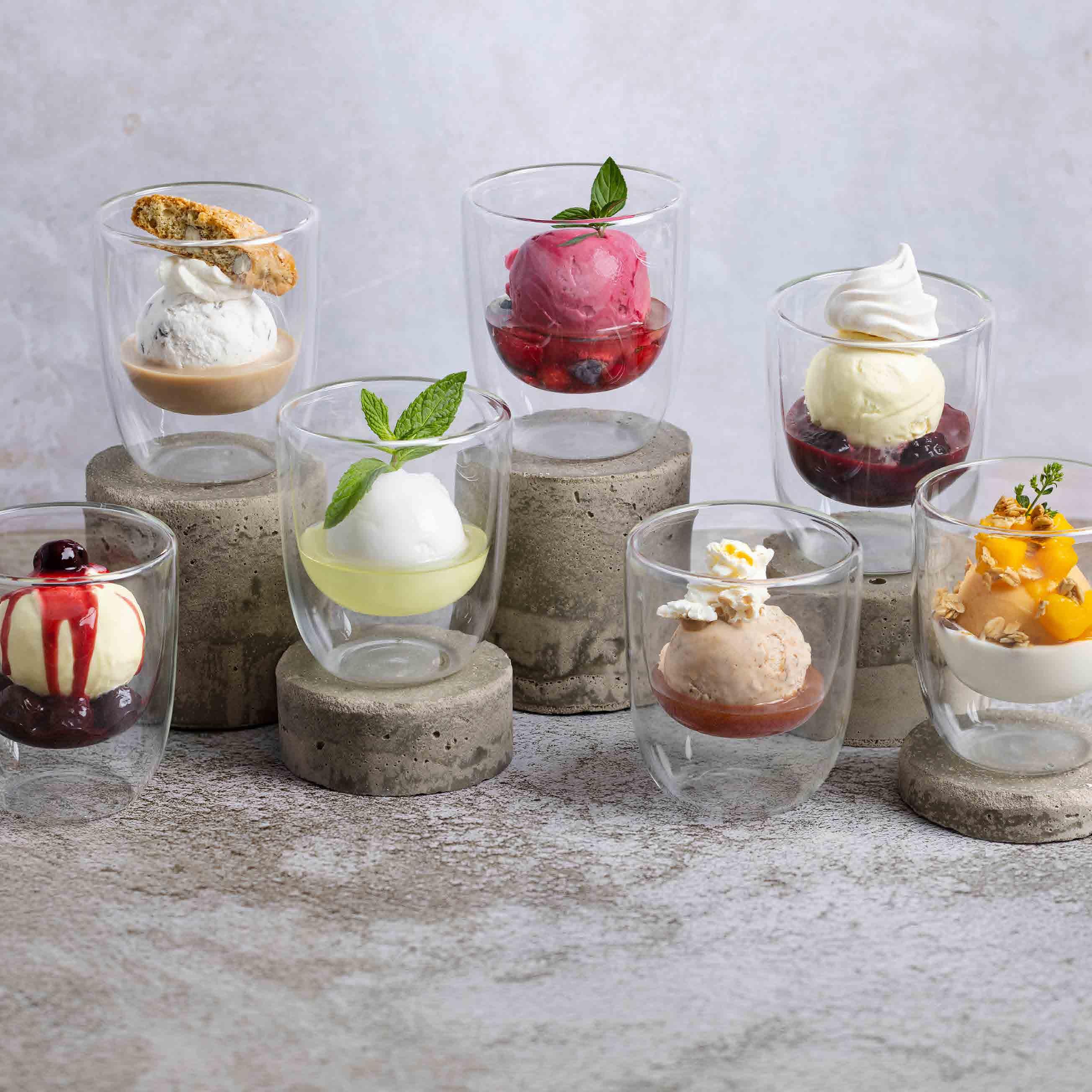 Baileys • Stracciatellaglace, Baileys, Rahm, Cantucci | Lillet • Himbeersorbet, Lillet , Beeren | Berry • Vanilleglace, Waldbeeren, Meringue | Grappa Cherry • Vanilleglace, Grappa-Kirschen | Limoncello • Zitronensorbet, Limoncello Toffee • Haselnussglace, Toffeesauce, gesalzenes Popcorn | Sunset • Mangosorbet, Mangokompott, Jogurt, Granola alle Mini-Coupes je 8.80