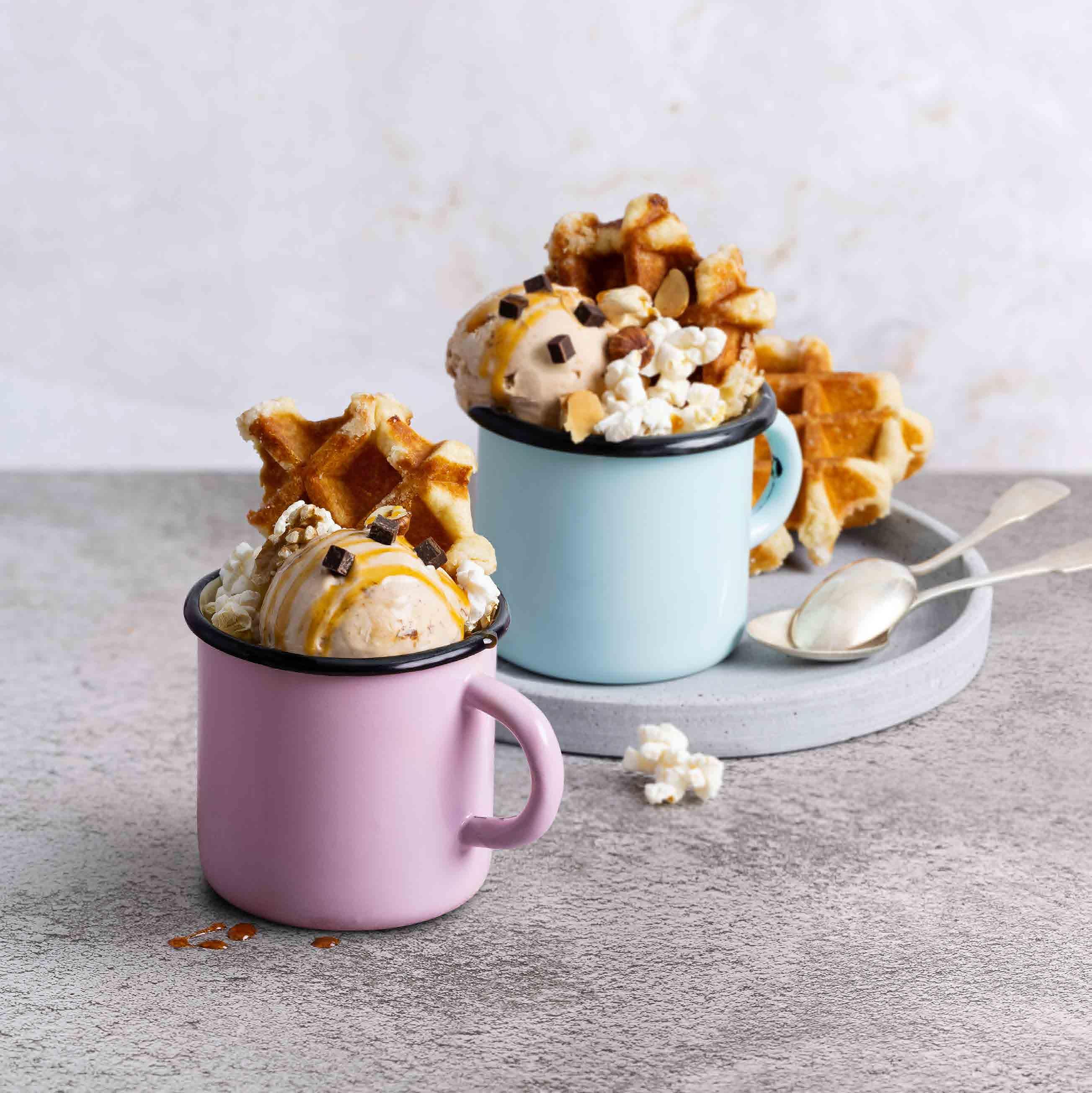 Waffel Joe • Haselnussglace, Schokoladenglace, Toffeesauce, gesalzenes Popcorn, Waffelstücke, Schokoladenstücke, Nüsse