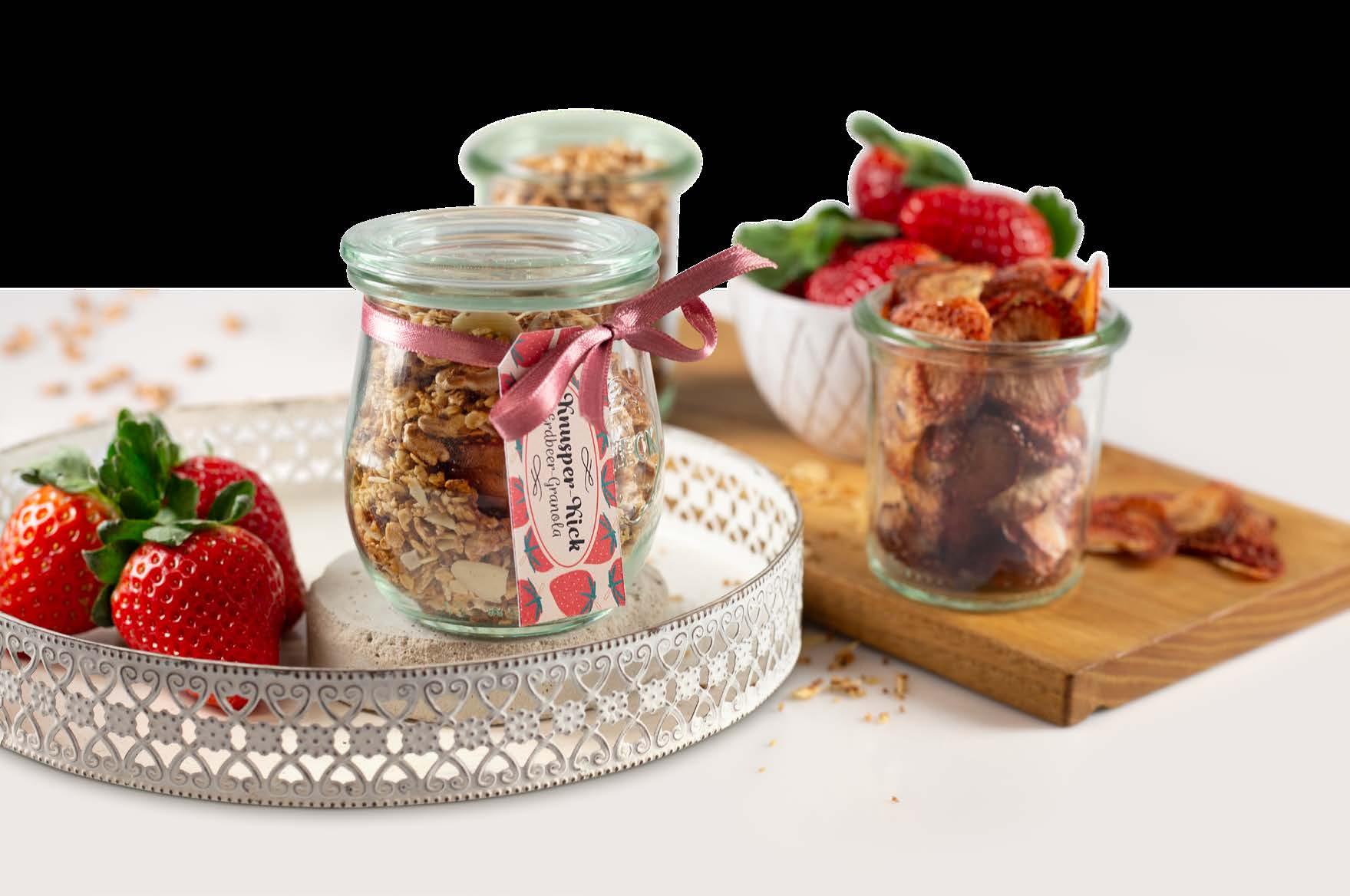 Erdbeeren sind im Frühling der Hit! Süss, saftig und vollgepackt mit Vitaminen. Wir zaubern daraus knusprige Chips und fangen den Frühling für später ein. Ein Power-Snack voller wertvoller Nährstoffe! Im Granola ersetzen sie Trockenfrüchte oder Schokostückchen –süss, knusprig, aber gesünder. Und hübsch verpackt ergibt dies ein ideales Mitbringsel für Ostern, Muttertag, Vatertag oder einfach so!