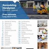 we are in business for many years and serve all long island NYC. our services include this: assembling attic awning basement bathroom blacktop brick bushes cabinets carpentry carpet ceiling ceramic clean-ups closets concrete concrete decks door dormer driveway drywall fencing flooring flooring framing gazebo gutter insulation junk removal kitchen laminate landscaping lawn maintenance marble masonry molding oak flooring painting patio paver plants porch portico powerwash railing retaining wall sanding sheds sidewalk siding sod staining stairs stone stoops stucco suspended ceiling tile wallpaper walls windows woodwork yard work (516) 238-0038