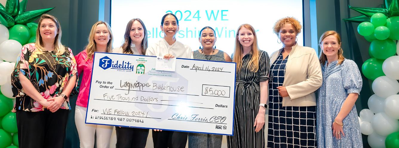 Each finalist gave a 10-minute pitch to the panel of judges, followed by an opportunity for questions and answers. After presentations wrapped up, attendees voted on an audience favorite. Robyn Smith of The Pretty Chemist was awarded that honor, receiving a prize of a facial from Audubon Facial Plastics and a gift basket courtesy of Fidelity P.O.W.E.R. Finally, the long-awaited moment: WE Fellowship event chair Diana Vasquez announced the winner of the 2024 JLNO Women’s Entrepreneur Fellowship, Lagniappe Baking. Owner and winner Kaitlin Guerin was presented a check by JLNO President Ashley Llewellyn and JLNO Community Council Director Rachel Robinson.