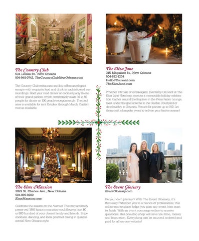 315 Magazine St., New Orleans 504-882-1234 Hello@Couvant.com TheElizaJane.com Whether intimate or extravagant, Events by Couvant at The Eliza Jane Hotel can execute a memorable holiday celebration. Gather around the fireplace in the Press Room Lounge, toast under the gas lanterns in the Garden Courtyard or dine lavishly in Couvant. Venues for parties up to 150. Let them craft a bespoke event to enliven your festive season!
