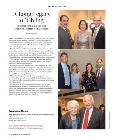 Jewish Children’s Regional Service (JCRS) held its “Jewish Roots of Cabaret” gala on February 24 at the New Orleans Marriott where Ned Goldberg, JCRS Executive Director, was honored and celebrated for his 30 years of leadership of the social service agency. Ned’s family was well-represented at the affair, as his son Adam acted as Emcee of the event while his daughter Jodie introduced her father, welcoming him to the stage to a standing ovation. Ned’s mother, Joyce, and brother, Brian, and his family attended from Cincinnati, along with many relatives and friends from coast to coast. The Marriott chefs created a dinner that included braised beef short ribs with demi-glaze and fingerling potatoes, and a Baked Alaska with warm chocolate sauce. Broadway actress and singer Leslie Castay, supported by a trio that included Jefferson Turner on piano, Gary Lehmann on bass and Bruce Miller on drums, gave a rousing cabaret set of classics from the Great American Songbook, including hits from Irving Berlin, Harold Arlen and George Gershwin. More than 360 patrons attended the evening that was Co-Chaired by Melinda Mintz and Michael Goldman. Honorary Co-Chairs included Joan and Gerald Berenson along with Shirley and Ralph Seelig. For 163 years, JCRS has provided needs-based scholarships, support and service to Jewish youth and families in the form of college aid, Jewish summer camp grants and assistance to children with special needs. Proceeds from the record-setting gala support vulnerable Jewish youth with scholarships and outreach programs within the JCRS seven-state service region. n
