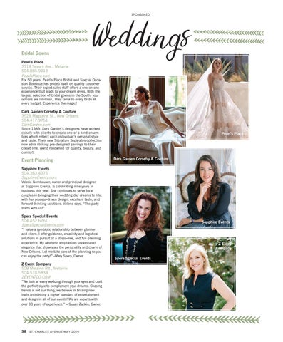 Z Event Company 508 Metairie Rd., Metairie 504.510.5838 ZEVENTCO.COM “We look at every wedding through your eyes and craft the perfect style to complement your dreams. Chasing trends is not our thing, we believe in blazing new trails and setting a higher standard of entertainment and design in all of our events! We are experts with over 30 years of experience.” – Susan Zackin, Owner.