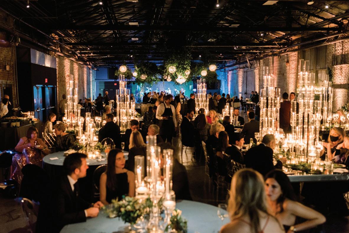 a blank slate that could be transformed into their dream space. Adele sketched out her vision of a glamorous indoor garden/greenhouse, and Elyse Jennings Weddings helped bring it to life. The pièce de résistance was the installation of chandeliers and clouds of greenery