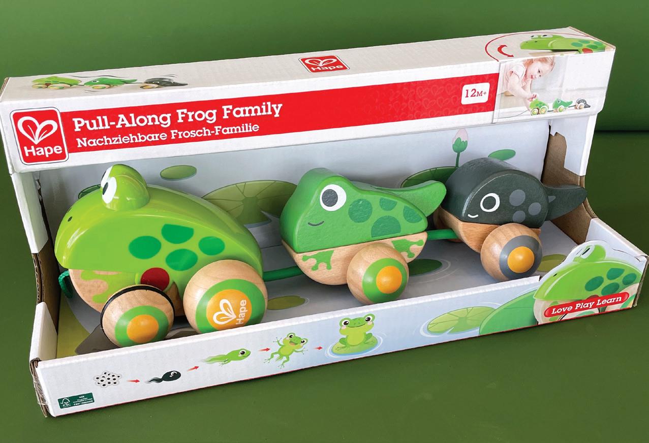 Hape Wooden Pull Along Frog Family. This lovely mama frog is taking her little ones for a walk. Pull the string and watch her mouth open & close. As you pull this frog family, you will see mama walk with her froglet and little tadpole wobbling along behind. $29.99.