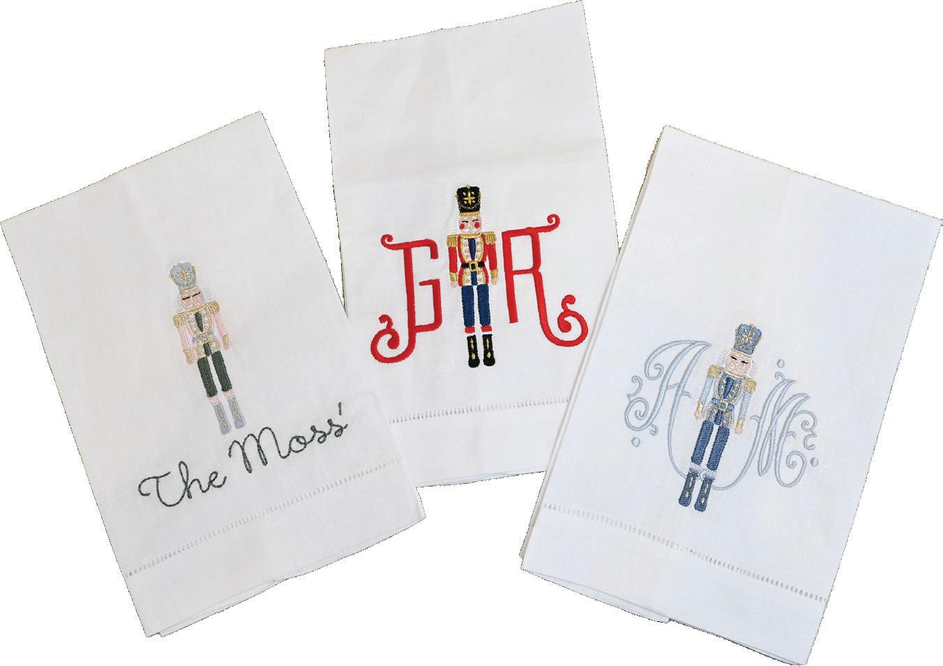 Linen hemstitch guest towels with nutcracker embroidery design.