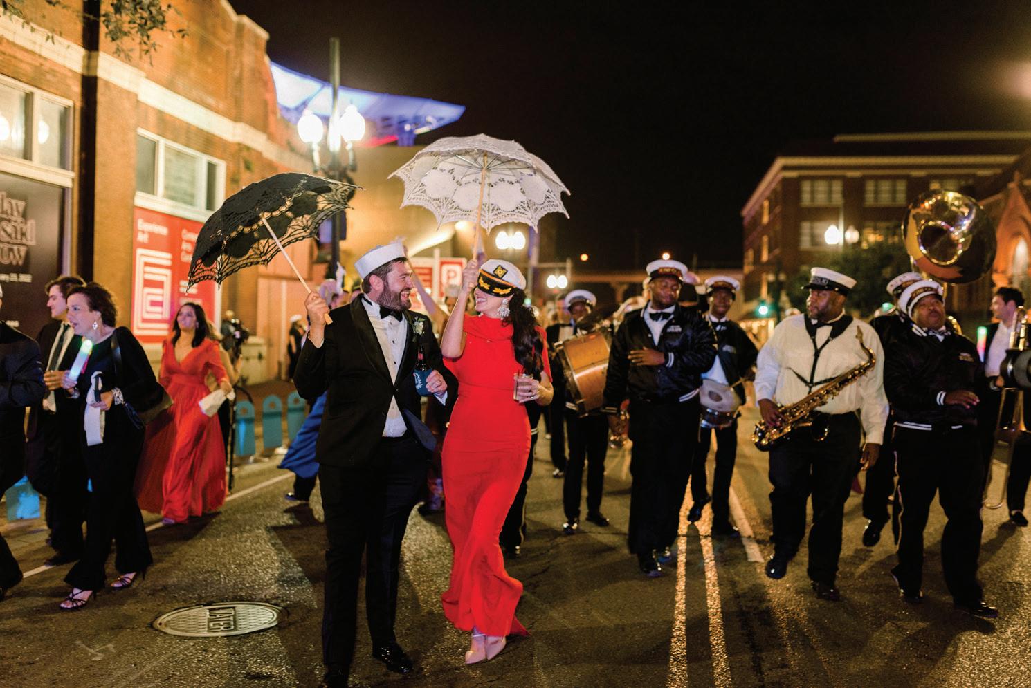 Of course, the dancers needed fuel, and the menu created by Black Pearl Catering had everyone raving. Popular items included duck and andouille gumbo bit terballen, buffalo soft-shell crab wings, a steak au poivre grits bar and chicken coq au vin. As the party rolled into the wee hours, guests were treated to late-night duck fat fries, a nod to Adele and Jonathan’s first date at Delachaise.