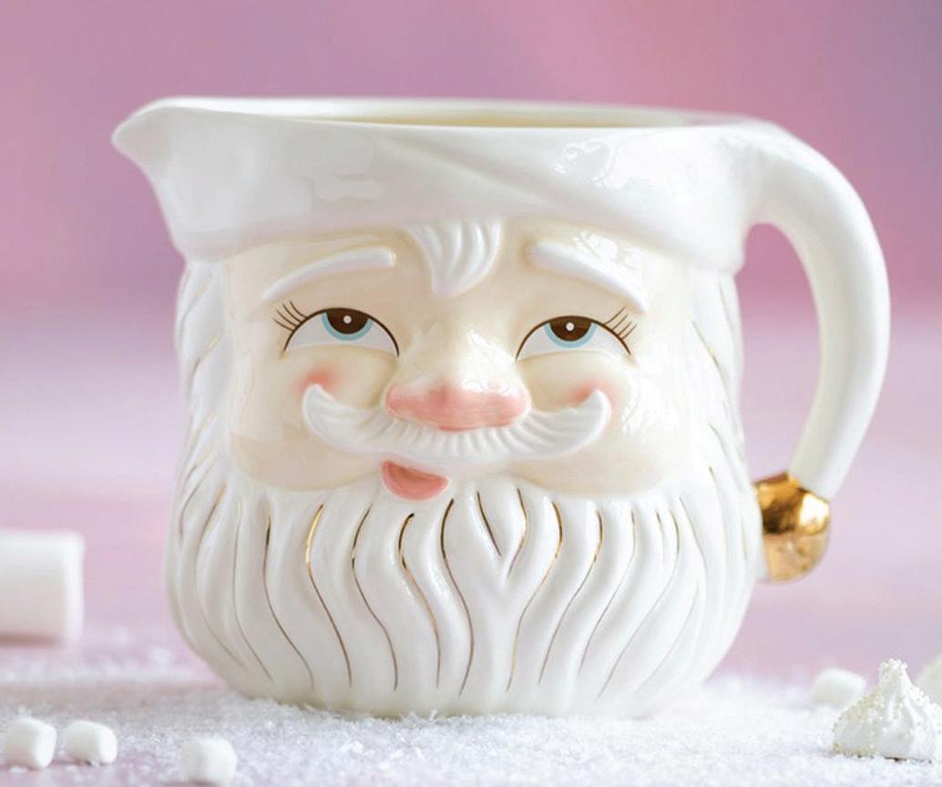 Make any holiday party a hit with the ceramic Papa Noel Pitcher from Glitterville. 8” tall, 96 ounces, hand-glazed with real gold details, $99.
