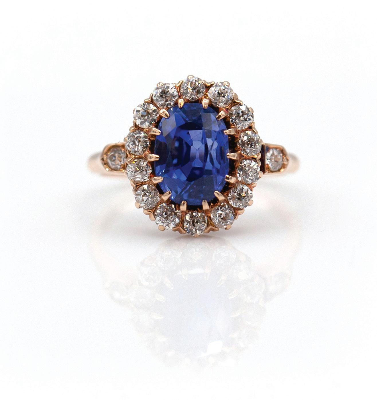 18k Victorian ring, featuring a 2.23ct oval Natural Ceylon Sapphire, surrounded by 0.60cts of diamonds (accompanied by GIA report). $12,500.