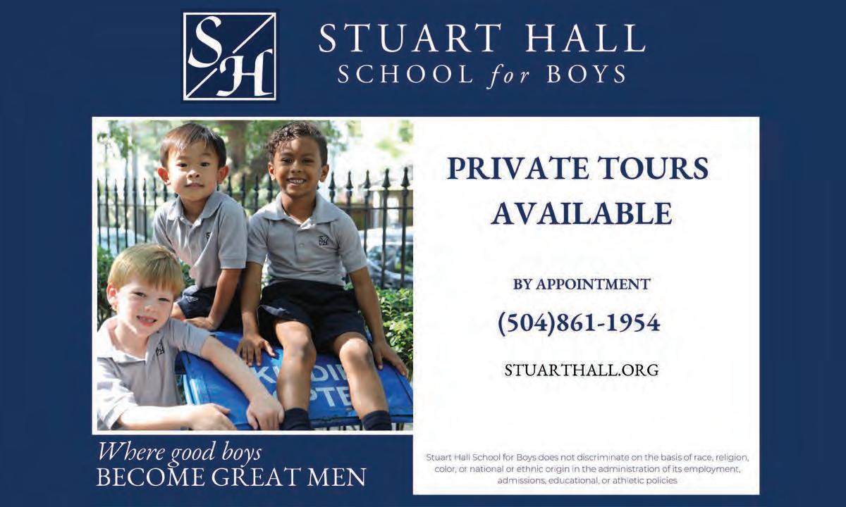 Stuart Hall holds membership in The Archdiocese of New Orleans, Independent Schools of the Southwest, National Association of Independent Schools, and the Independent Boys’ Schools Coalition. To schedule a private tour of the campus located at 2032 S. Carrollton Avenue, visit stuarthall.org or call 504-861-1954.