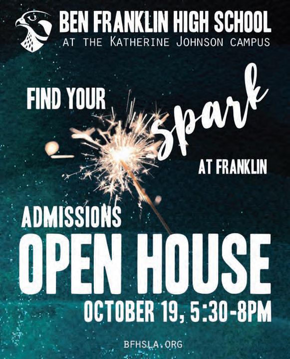 Find your spark at Franklin—with curious and creative high-achieving students from every ZIP code in the city, Benjamin Franklin High School revels in its diversity. A five-time Blue Ribbon school with dozens of electives and Advanced Placement classes, 20 sports teams, and over 50 clubs, Ben Franklin challenges students and allows them to discover their passions. Visit bfhsla.org to learn more about the school and its Open House on October 19 from 5:30 p.m. to 8 p.m.