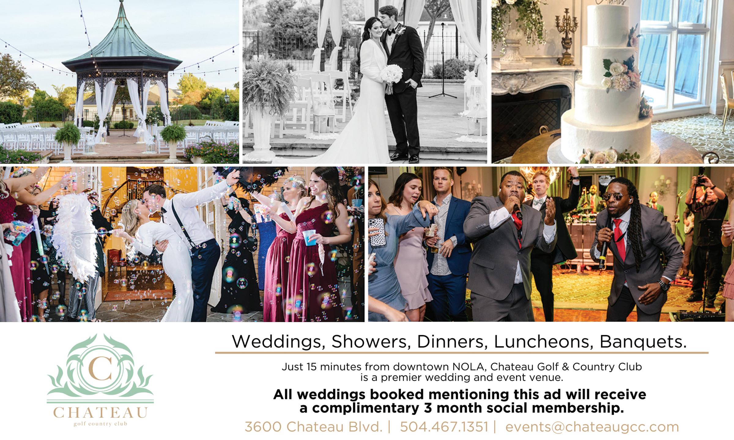 A luxury club just 14 miles outside New Orleans, the Chateau Golf & Country Club is the pinnacle of Southern decadence, steeped in romance, culture, and hospitality. This June, July, and August, enjoy 10% off all weddings, and let us make your big day a perfect one. Learn more at chateaugcc.com.