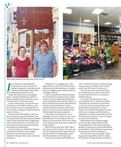 said. “It took us five years to make enough money to pay us a salary. It was $25 per week, then $50, then $75 and so on.” Now the business makes more than $3 million per year and is rated one of the top 100 f lorists in the country by Telef lora Florist. “In my day, the dream was to be a stay-at home-mom,” said Donna Villere. “I did help out as much as I could when we started, and I was proud to have my husband take such good care of our family. The world has changed since then and I am very happy that this business offered me so much. I could work and still be there for my children. I am very happy we started this business.” Roger Villere’s love of plants began at an early age, and he shared it with his grandparents, who always had large gardens. In particular, he learned from his grandmother: “She could take a pencil, put it in the ground and it would grow.” When he was in seventh grade, Villere began growing orchids, which he sold to local florists. In high school he worked at Photos courtesy of Villere Florist and Jeff Johnston