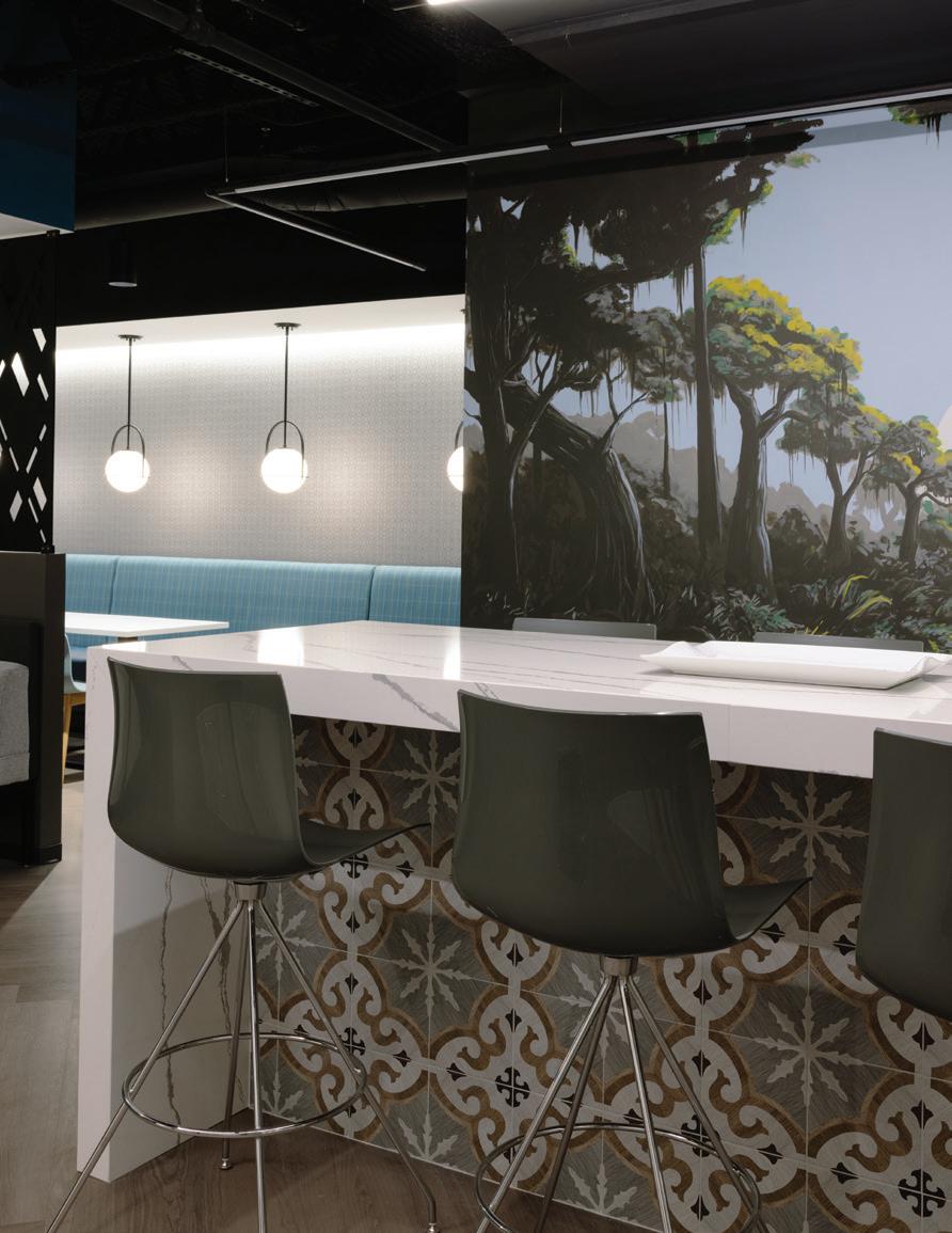 According to Norris, standout features include the artwork, the use of the HUB logo on conference room doors and the cafe, all of which exemplify HUB’s local and regional work environment. “Our cafe is especially personalized to the region,” he says. “A hand-painted mural of New Orleans City Park provided by a local set designer now adorns our dining area. It is a favorite of our employees.” T
