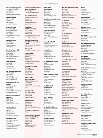 Loews New Orleans Hotel 300 Poydras St. New Orleans 504-595-5316 loewshotels.com Louisiana State Museum 751 Chartres St. New Orleans 504-568-6968 louisianastatemuseum.org Luminous Events of New Orleans 249 Villemar Place Terrytown, LA 70056 504-324-6441 luminouseventsnola.com Maison de Cheveux 201 St. Charles Ave. suite #127 New Orleans 504-908-4247 maisondecheveux@gmail.com Maison Dupuy Hotel 1001 Rue Toulouse New Orleans 504-648-6114 sales@maisondupuy.com neworleanscourtyardweddings. com Martin Wine Cellar 3827 Baronne St. New Orleans 714 Elmeer Ave Metairie La 504-896-7351 martinwine.com/catering