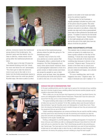 Bring Your Optimistic Attitude The easiest way to ensure your photos come out great is to make sure you have a great outlook on the day of the wedding. “I think the most important thing is the attitude of the bride on her wedding day because it shows in her pictures,” Orgeron says. Trying not to stress is the best way to insure your photos come out beautifully, because if you are relaxed and happy, your photos will reflect that. “It’s your wedding day, and it only happens one time,” Orgeron says, “so enjoy it because you can’t replay it.” n