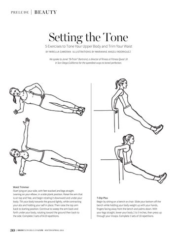 5 Exercises to Tone Your Upper Body and Trim Your Waist By Mirella Cameran illustrations by Marianne Angeli Rodriguez We spoke to Janet “B-Train� Bertrand, a director of fitness at Fitness Quest 10 in San Diego California for the speediest ways to toned perfection.