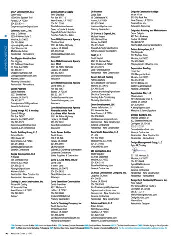 DB Framers Danal Boss 16 Cobblestone W. Houma, LA 70364 985.855.5656 bossdanal@yahoo.com Framing Contractors DC Stucco & Drywall, Inc. Michael Mogue 1924 Airline Drive Kenner, LA 70062 504.915.5041 Drywall & Plaster Contractors Siding & Stucco Contractors DDSC, LLC David Haydel 4801 St. Bernard Ave. New Orleans, LA 70122 504.343.4075 Ddsc1@bellsouth.net Residential - New Construction Dean’s AC and Heating Patricia Walters 6245 Westbank Expressway Marrero, LA 70072 504.485.9226 Deansacandheating@gmail.com Electrical Contractors Heating & Air Conditioning Plumbing Contractors Decro Development, LLC Dennis deBoisblanc, Jr 619 Homedale Ave. New Orleans, LA 70124 504.836.2005 info@decrodevelopment.com Commercial - New Construction General Contractors Residential - New Construction Deep South Associates, LLC JP Leze P.O. Box 1400 Madisonville, LA 70447 504.913.1085 JPLezeIII@aol.com DEI Contractors, LLC Walter Baudier 3330 W. Esplanade Metairie, LA 70002 504.836.2155 Bbaudier@dei-engr.com General Contractors