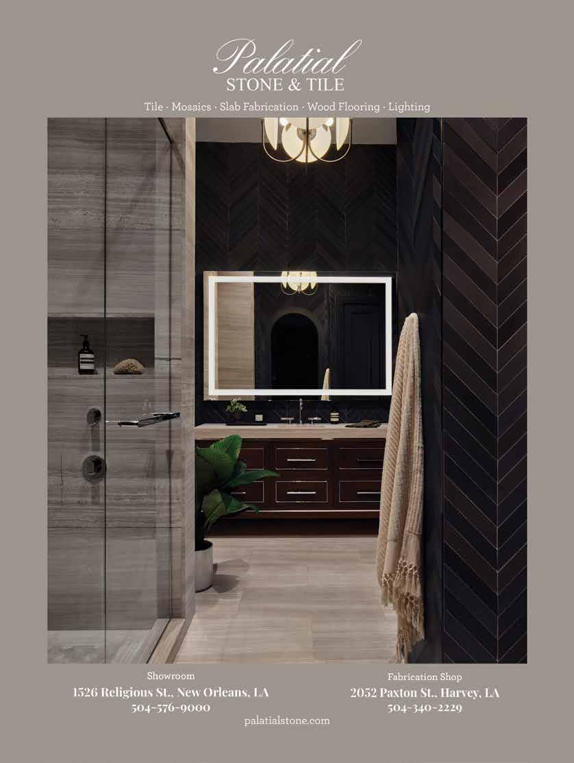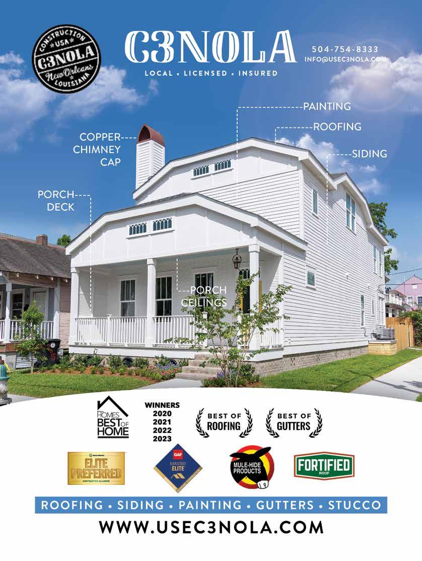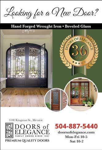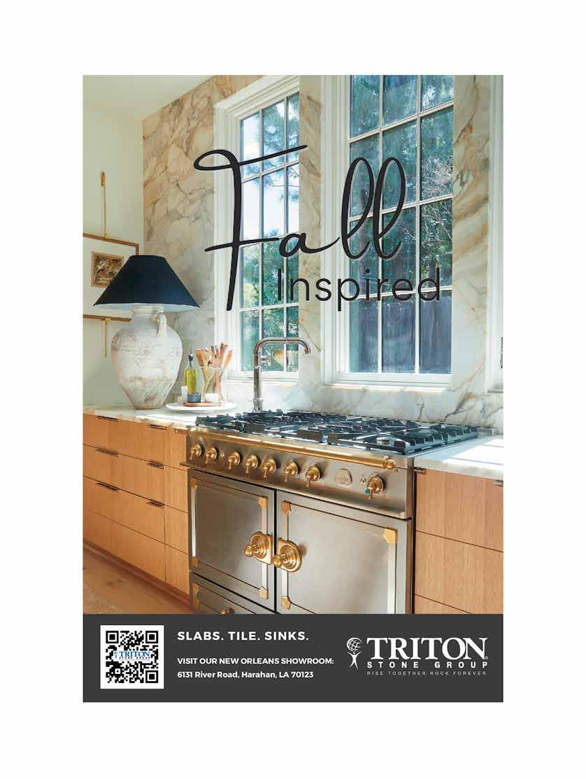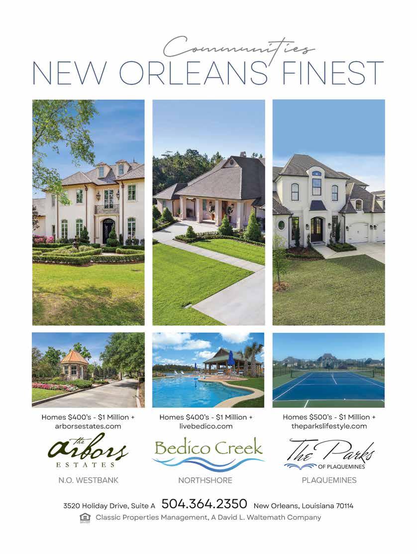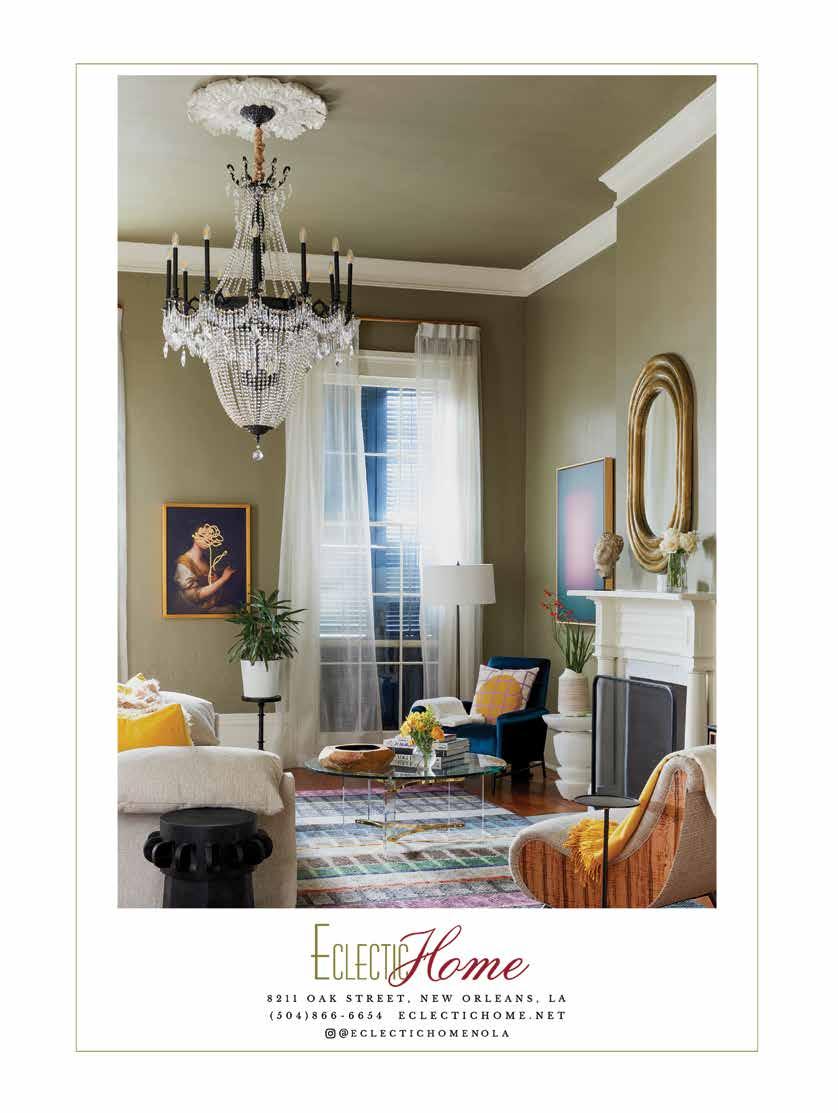 New Orleans Homes and Lifestyles, ISSN 1933-771X is distributed four times a year and published by Renaissance Publishing LLC, 110 Veterans Memorial Blvd., Suite 123, Metairie, LA 70005; (504) 828-1380. For a subscription visit on line at MyNewOrleans.com. Periodicals Postage Paid at Metairie LA and Additional Entry Offices. POSTMASTER: Send address changes to New Orleans Homes & Lifestyles, 110 Veterans Memorial Blvd., Suite 123, Metairie, LA 70005. Copyright © 2023 New Orleans Homes & Lifestyles. No part of this publication may be reproduced without the consent of the publisher. The trademark New Orleans Homes & Lifestyles Magazine is registered. New Orleans Homes & Lifestyles is not responsible for unsolicited manuscripts, photos and artwork even if accompanied by a self-addressed stamped envelope. The opinions expressed in New Orleans Homes & Lifestyles are those of the authors and do not necessarily reflect the view of the magazines’ managers or owners. AUTUMN 2023 / VOLUME 26 / ISSUE 4 48 68 26 24