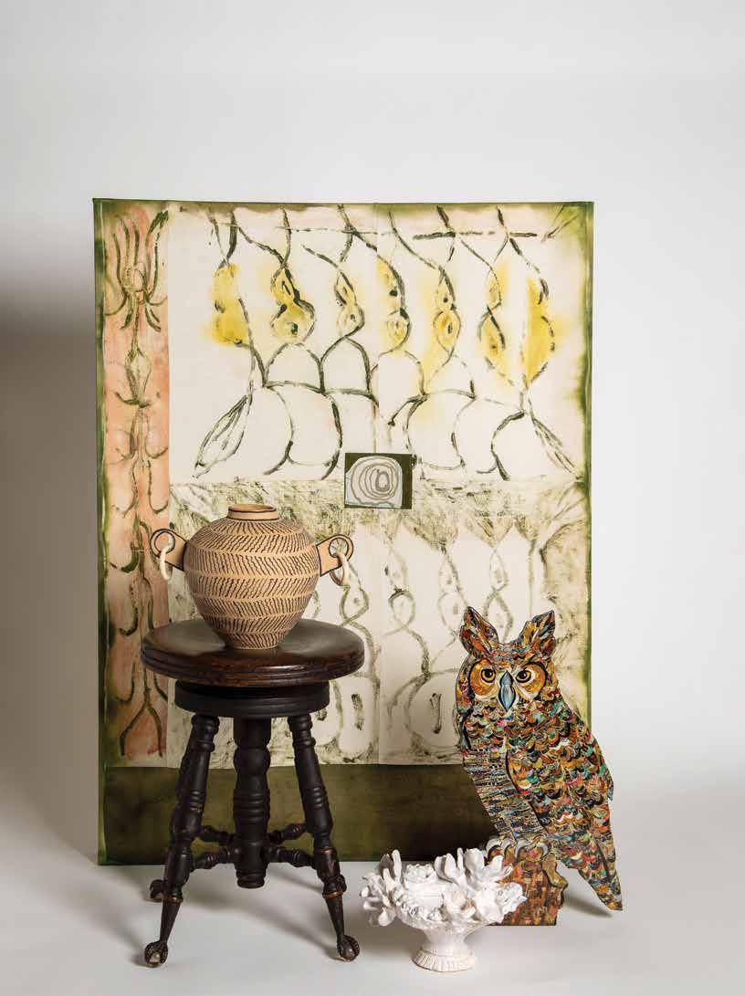 This 49-inch-by-39inch (framed) “Self Portrait” by Ansley Givhan combines ink, watercolor, natural pigment, thread and monotype on muslin for a natural feel. $3,100, Sunday Shop, 2025 Magazine St., sundayshop.co