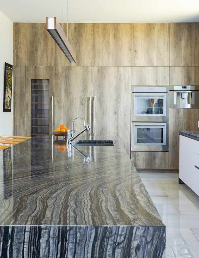 In the world of stone slabs, man-made quartz still reigns, but other stones are beginning to test its sovereignty. Often readily available, quartz offers consistent colors and patterns with significant durability. According to Legend Interiors Kitchen and Bath Designer Nicole Ruppel Jones, quartz has come a long way since its traditional polished application, and adding texture and feel changes the dynamic of a room. Nicole Ruppel Jones recommends a honed finish for a matted suede look, while a leathered finish provides organic appeal.