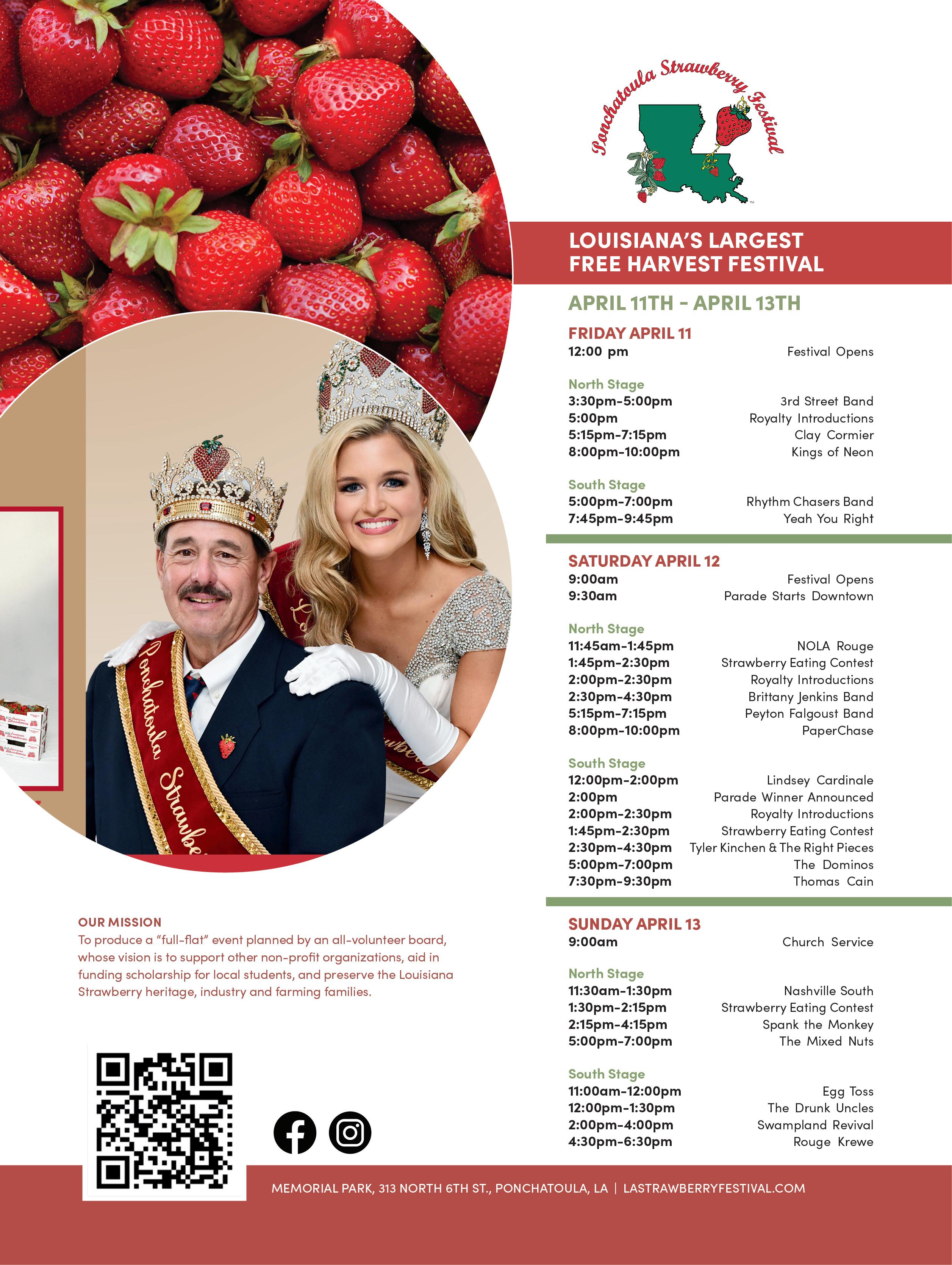 dence Sicilian Heritage Festival – March 7-9, Amite Oyster Festival is April 14-16, Hammond BBQ Challenge – March 28-29, Ponchatoula Strawberry Festival – April 11-13, and The Italian Festival – April 25-27. To learn more, and plan your trip, please visit tangitorism.com.